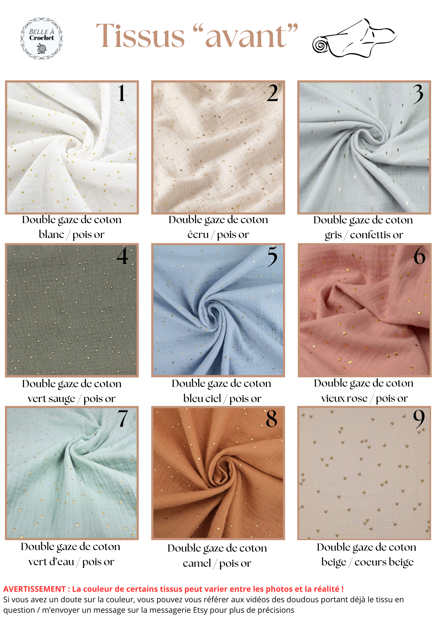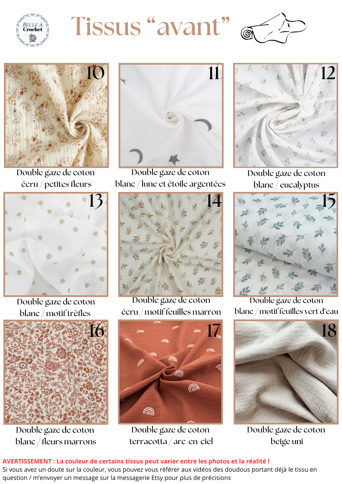 â ïžMĂȘme si les doudous sont rĂ©alisĂ©s de la maniĂšre la plus sĂ©curitaire quâil soit, il est nĂ©cessaire de les contrĂŽler rĂ©guliĂšrement afin de dĂ©tecter les signes dâusures Ă©ventuels, notamment avec des enfants en bas Ăąges.